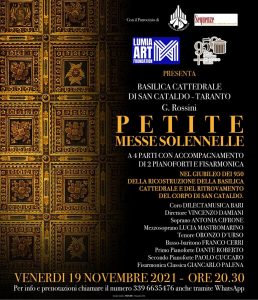 Lumia Art Foundation presenta presso la Basilica Cattedrale San Cataldo di Taranto, l’opera di Gioacchino Rossini “Petite Messe Solennelle”, scritta nel 1863. Venerdì 19 Novembre 2021 a partire dalle ore 20,30. Opera a quattro parti con accompagnamento di due pianoforti e Fisarmonica Classica.