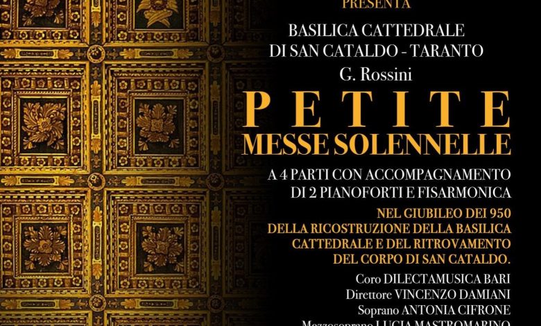 Nel Giubileo dei 950 della ricostruzione della Basilica Cattedrale e del ritrovamento del Corpo di San Cataldo, il mezzosoprano Lucia Mastromarino, affiancata dal Soprano Antonia Cifrone, dal Tenore Oronzo D’Urso, dal Bass-Baritono Franco Cerri, dai due pianoforti di Dante Roberto e Paolo Cuccaro, dal Coro Dilectamusica Bari e dalla fisarmonica classica di Giancarlo Palena, diretti dal Maestro Vincenzo Damiani, eseguiranno una delle composizioni più amate ed emozionanti   di Giocchino Rossini “PETITE MESSE SOLENNELLE” nel cuore della Basilica Cattedrale San Cataldo a Taranto il 19/11/21 ore 20,30-21,00 . La delicatezza della composizione Rossiniana dove lo squisito amalgama vocale tra le voci maschili e quelle femminili faranno venire la pelle d’ oca ed emozioneranno il pubblico in un susseguirsi di melodie senza tempo. Nella petite messe solennelle ogni pagina è densa di passione e sentimento. Un evento da non perdere in una cornice che lascia lo spettatore senza fiato. Lumia Art Foundation ha voluto sostituire L’ harmonium come scritto in partitura originale da Rossini con la fisarmonica classica come Simbolo di tenacia, forza, astuzia, bellezza, artigianalità, consapevole che se Rossini fosse nato e vissuto ai nostri giorni avrebbe gradito moltissimo questa sostituzione. Per info e prenotazioni chiamare il numero 339 6635476 oppure scrivere a events@lumiaartfoundation.net