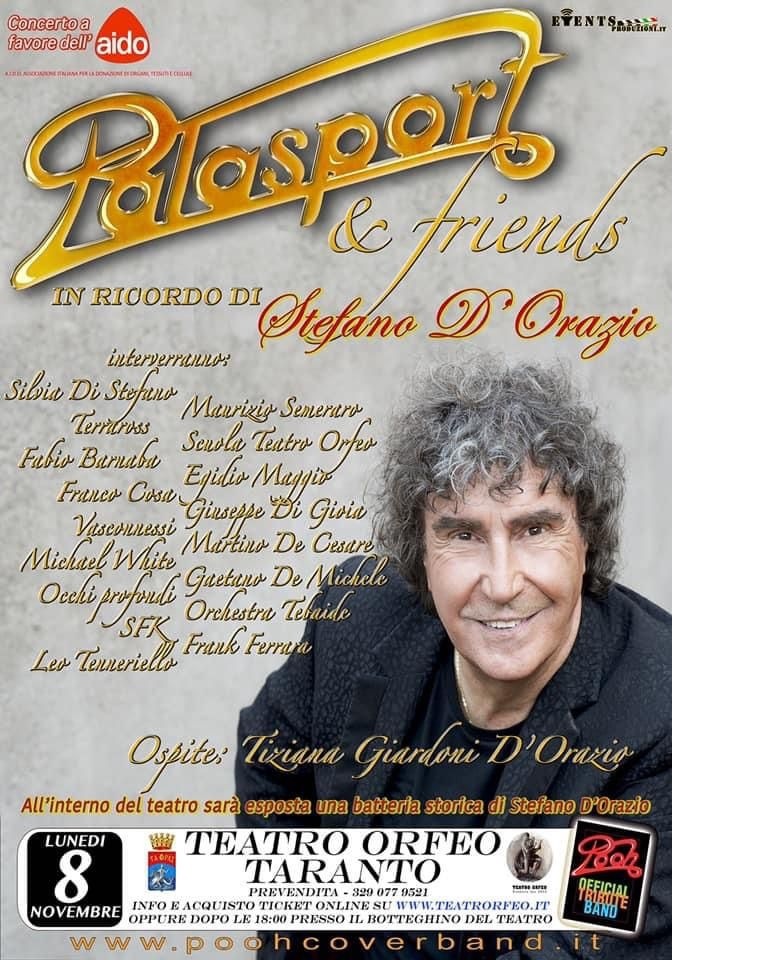 A un anno dalla scomparsa del batterista, i Palasport gli dedicano un tributo con cantanti, musicisti, una sezione d’archi e performer pugliesi, alcuni dei quali hanno collaborato con lo stesso Stefano. Questi gli artisti che hanno assicurato la loro presenza: Silvia Di Stefano, Maurizio Semeraro, Terraross, Scuola di teatro Orfeo, Fabio Barnaba, Egidio Maggio, Franco Cosa, Giuseppe Di Gioia, Martino De Cesare, Michael White, SFK, Vasconnessi, Leo Tenneriello, Gaetano De Michele, Occhi profondi, Studio teatro danza, Frank Ferrara, Orchestra Tebaide. Il ricavato del concerto sarà devoluto a favore dell’Associazione Italiana Donatori organi, per la quale per anni D’Orazio è stato testimonial. All’evento in programma al teatro Orfeo interverrà il videpresidente nazionale Aido, Vito Scarola.