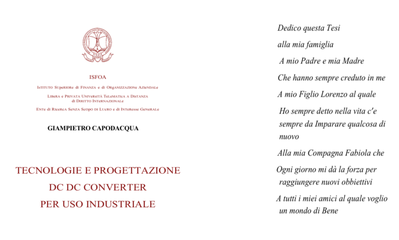 il titolo della pubblicazione che prende forma dalla tesi scritta dall’ing. Capodaqua è “Tecnologie e progettazione dc converter per uno industriale”.