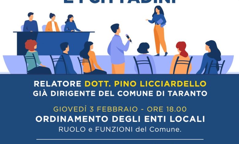 Parte ufficialmente il 3 febbraio alle ore 18 nella sede del piazzale Bestat, la formazione politico amministrativa, una nuova iniziativa messa in campo da Taranto Crea che punta su due valori imprescindibili: la consapevolezza e la formazione. Il programma prevede tre primi appuntamenti che saranno condotti dal dottor Giuseppe Licciardello, già Capo di Gabinetto di diverse legislature comunali che fornirà, in modo semplice e pratico, elementi di conoscenza sul ruolo e l’articolazione degli Enti Locali, in particolare sul Comune, l’ordinamento degli enti locali con un approfondimento sul ruolo e sulle funzioni del Comune e della complessa macchina amministrativa; i compiti e le funzioni del Sindaco e degli altri organi di governo, dagli assessori ai consiglieri comunali per finire con un focus sugli atti del comune con tutto ciò che vuol dire garantire la trasparenza e la partecipazione. Può essere una buona opportunità per acquisire maggiore conoscenza della realtà comunale per quanti volessero impegnarsi politicamente nella prossima competizione elettorale comunale.