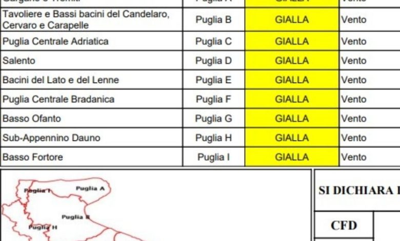 E’ allerta gialla per le prossime 24 ore nella Regione Puglia, i venti da forti a burrasca dai quadranti settentrionali, con rinforzi fino a burrasca forte, rischio idrogeologico. Massima attenzione.