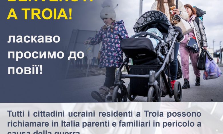 A partire da oggi, tutti i cittadini ucraini che vivono a Troia possono richiamare in Italia parenti e familiari in pericolo a causa della guerra.  Il Comune offrirà loro vitto e alloggio.