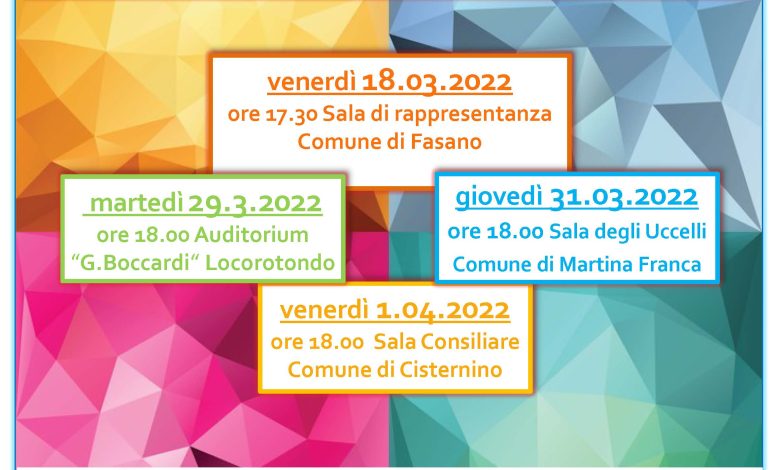 Verrà presentato venerdì 18 marzo alle ore 17.30 a Fasano presso la Sala di Rappresentanza per proseguire martedì 29 marzo a Locorotondo presso l’Auditorium “G. Boccardi” ed il 31 marzo a Martina Franca presso la Sala degli Uccelli del Comune per chiudere in bellezza il 1° aprile a Cisternino nella sala consiliare. Pubblicato nei giorni scorsi, il bando del GAL Valle d’Itria è rivolto alle start up ma anche ad aziende già esistenti che intendano migliorare la propria dotazione.
