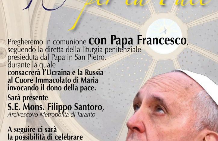 Dopo l’invito di Zelensky, l’ambasciatore italiano assicura: “Faremo il possibile per organizzare la visita“. Il Pontefice ha invitato i fedeli a unirsi a lui nella preghiera del 25 marzo per chiedere “al Signore l’intercessione della Madonna di Fatima, il dono della pace”, anche il nostro arcivescovo Filippo Santoro, si unirà spiritualemnte a papa Francesco per la consacrazione al Cuore Immacolato di Maria.