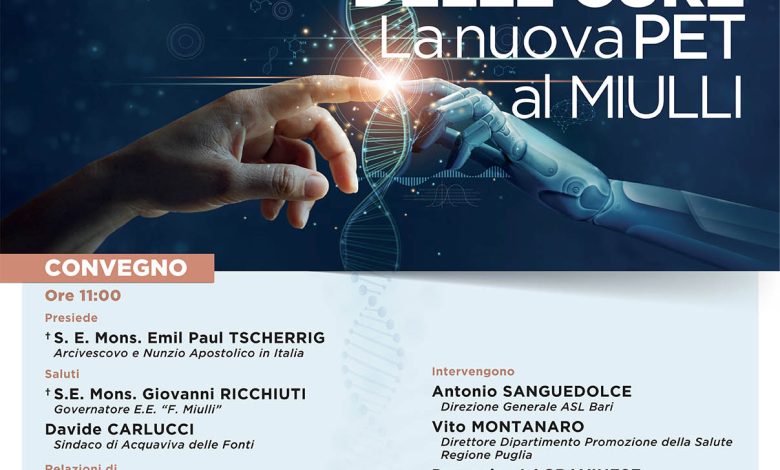 La mattinata partirà alle ore 11.00 con il Convegno sull’Umanizzazione delle cure, tema fondamentale al centro della mission dell’Ospedale Miulli e ancor più attuale grazie all’attivazione della nuova PET. A presiedere l’incontro sarà il Nunzio Apostolico S. E. Mons. Emil Paul Tscherrig, mentre i saluti istituzionali saranno affidati a S.E. Mons. Giovanni Ricchiuti, Governatore dell’E.E. “F. Miulli”, e a Davide Carlucci, sindaco di Acquaviva delle Fonti. Seguiranno le relazioni della dott.ssa Isabella Bruno (Direttore U.O.C. Medicina Nucleare del Miulli), di Rocco Palese (Assessore alla Sanità della Regione Puglia) e di Michele Emiliano (Presidente Regione Puglia). Durante il convegno sarà anche presentato il video di presentazione dell’U.O.C. di Medicina Nucleare del Miulli con un focus sulla PET/CT e sui due nuovi tomografi EVO e INTEVO.