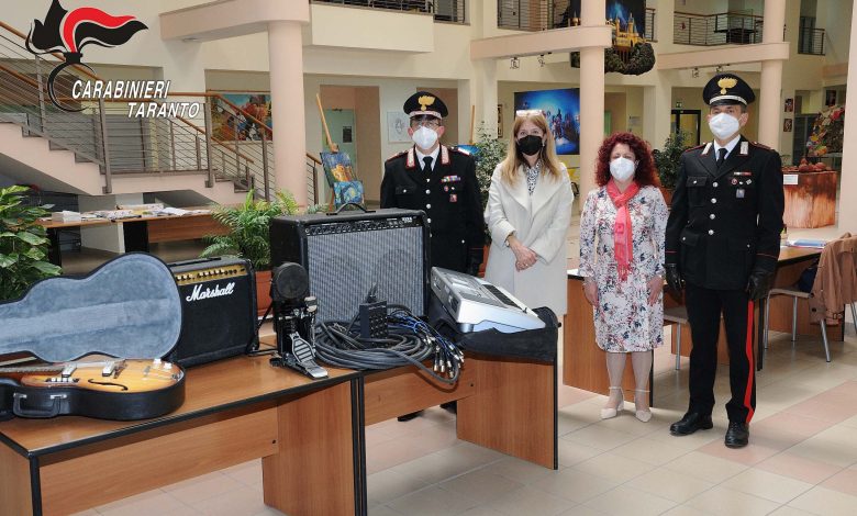 I Carabinieri della Compagnia di Massafra hanno restituito questa mattina alla dirigente dell’Istituto comprensivo De Ruggeri gli strumenti musicali e gli altri materiali rubati nella notte tra il 27 e il 28 marzo dall’aula multimediale della scuola, quando qualcuno aveva forzato una porta antipanico del complesso ed aveva portato via amplificatori, tastiere e chitarre che valevano circa 10 mila euro.