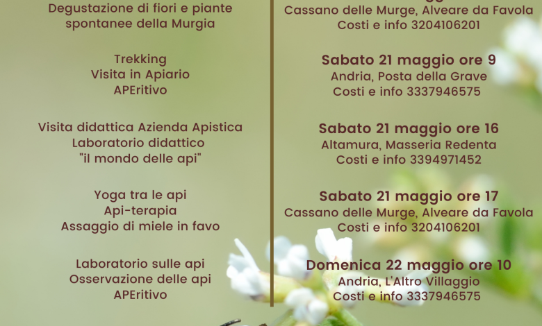 Al via da domani nell’Alta Murgia l’iniziativa “Apiari aperti”, una tre giorni in occasione della “Giornata mondiale delle api” che ricade il 20 maggio di ogni anno, per sensibilizzare la comunità del Parco sull’importanza di tutelare questi operosi insetti. 20, 21 e 22 maggio aprono le porte al pubblico quattro aziende didattiche del territorio: Alveare da Favola a Cassano delle Murge, Masseria Redenta ad Altamura, Posta della Grave e L’Altro Villaggio ad Andria, che guideranno i visitatori in attività di educazione ambientale e benessere sul mondo delle api. Sono in programma visite didattiche nelle aziende con esperti apistici, passeggiate botaniche, trekking, degustazioni di miele, fiori e piante spontanee della Murgia, apiterapia, APEritivi, yoga tra le api e laboratori di conoscenza sull’apicoltura. L’obiettivo è osservare e interagire con le api, comprendere come l’ape raccoglie il nettare dai fiori e lo trasforma in miele, diffondendo la conoscenza del prezioso ruolo dell’Apis mellifera.