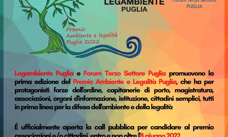 Legambiente Puglia da quest’anno ha deciso di promuovere il Premio Ambiente e Legalità Puglia, l’edizione regionale del premio giunto alla sua XVII edizione a livello nazionale, che ha per protagonisti Forze dell’Ordine, Capitanerie di Porto, magistratura, associazioni, organi di informazioni, istituzioni e cittadini semplici, tutti in prima linea per la difesa dell’ambiente e della legalità. L’edizione pugliese vede la collaborazione tra Legambiente Puglia e Forum Terzo Settore Puglia proprio per rimarcare e sottolineare l’importanza e valore sociale del premio e riconoscimento. Al fine diffondere il premio il più possibile, per dare occasione ai territori di raccontarsi e raccontare le proprie attività e protagonisti, si è deciso di chiedere a associazioni, enti e/o cittadini di presentare la propria candidatura (dell’associazione, di un’attività, progetto, persona, ecc), attraverso un apposito modulo, in cui spiegare le motivazioni e con alcune referenze e testimonianze che sostengano il proprio candidato.