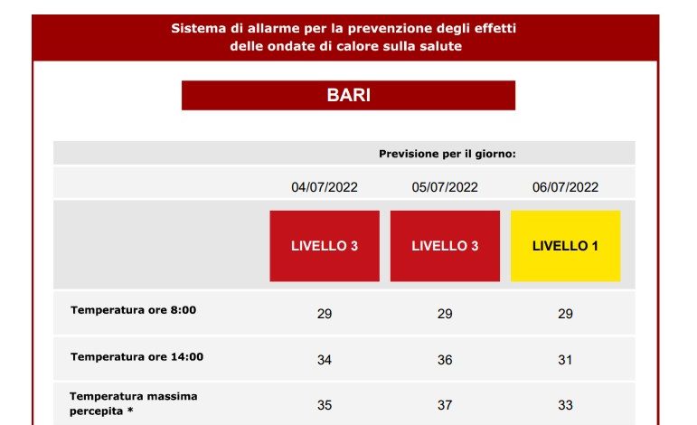 Bari: ondata di calore; ultima giornata da livello 3, da domani livello 1