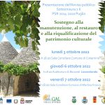 Si terranno lunedì 3 ottobre a Cisternino pressola sala consiliare del Comune, il 6 ottobre a Locorotondo presso l’Auditorium “G. Boccardi”ed il 7 ottobre a Martina Franca presso la sala consiliare del Comune(tuttialle ore 18.00) i prossimi incontri dedicati alla presentazione del bando pubblico regionale per la manutenzione, il restauro e la riqualificazione del patrimonio culturale del paesaggio rurale(Misura 7.6) nell’ambito del Piano di Sviluppo Rurale 2014/2020.