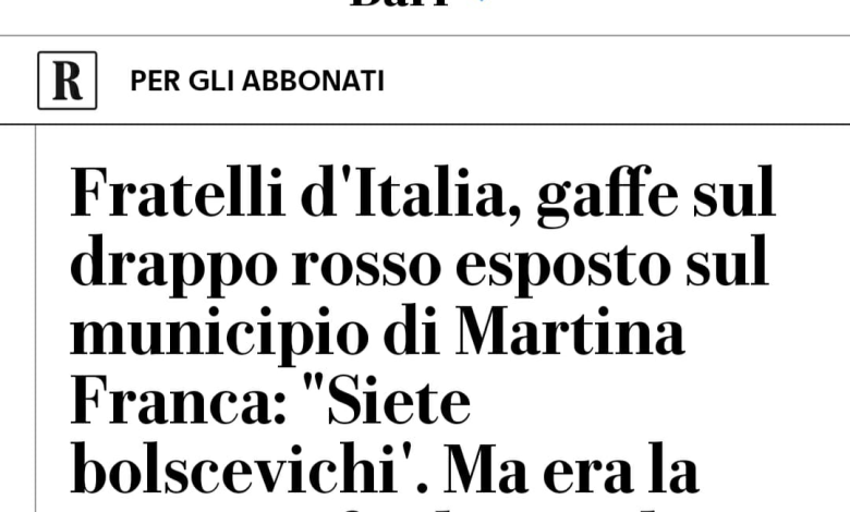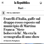 Infine la grande gaffe diventata virale ed apparsa su dei quotidiani nazionali, relativa ad un drappo rosso apparso sul Palazzo Ducale come scenografia dell’evento “Il sogno italiano – The musical”, nato per accogliere la delegazione di cento diplomatici, nel corso del quale venti musicisti hanno eseguito brani dal musical “Les miserables”, per il quale la Coordinatrice di Fratelli d’Italia ha immediatamente fatto un esposto/reclamo al Sindaco ritenendolo una mancanza di rispetto dell’Amministrazione Comunale (democratici di Stalingrado)