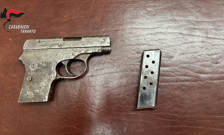 Nella circostanza i militari durante una perquisizione di un vano del fabbricato, all’interno di un armadietto di proprietà di un 47enne, hanno rinvenuto e sequestrato, una pistola semiautomatica di produzione est europea, marca “Cesca Zbrojovka” cal. 6.35 priva di matricola, bene occultata nella tasca di un indumento.