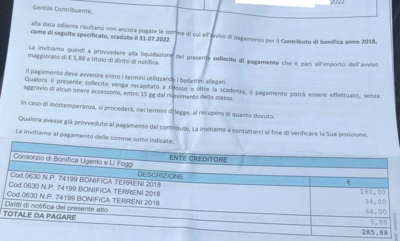 Nessun servizio, ma in compenso tante cartelle da pagare, anche e soprattutto per dei servizi di cui non vi è traccia da anni. In questi giorni, in tutto il Leccese, stanno arrivando agli agricoltori nuove cartelle e i relativi solleciti di pagamento dal Consorzio di Bonifica Ugento e Li Foggi. In molti casi si tratta di somme relative ai servizi di bonifica riguardanti l’anno 2018.