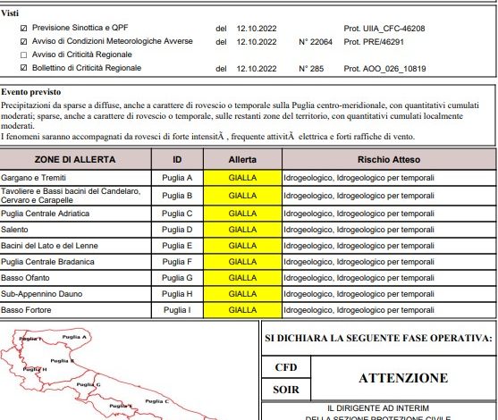 Precipitazioni da sparse a diffuse, anche a carattere di rovescio o temporale sulla Puglia centro-meridionale, con quantitativi cumulati moderati; sparse, anche a carattere di rovescio o temporale, sulle restanti zone del territorio, con quantitativi cumulati localmente moderati. I fenomeni saranno accompagnati da rovesci di forte intensità , frequente attività elettrica e forti raffiche di vento.
