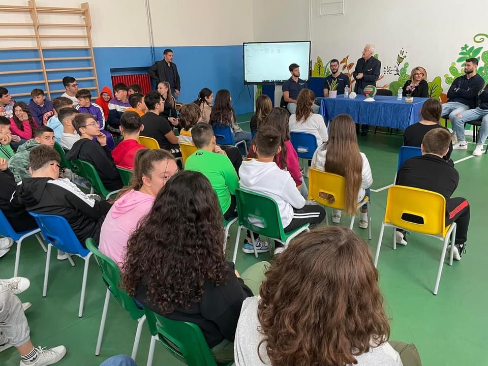 È terminata in uno scambio di palleggia “tra amici” l’incontro della Gioiella Prisma Volley Taranto con l’I. C. Galileo Galilei. Una delegazione della squadra capeggiata dal presidente Tonio Bongiovanni e dal vicepresidente Elisabetta Zelatore hanno infatti fatto visita alla scuola, dove sono stati accolti dalla D.S. Antonietta Iossa e da una sessantina di giovani studenti delle classi terze della scuola secondaria di primo grado. Grande entusiasmo nel confronto con i quattro giocatori (il palleggiatore Francesco Cottarelli, il centrale Giovanni Gargiulo, il libero Francesco Pierri e l’opposto Manuele Lucconi) a cui i ragazzi hanno rivolto una serie di domande e di curiosità. Gli atleti hanno risposto dimostrando disponibilità e simpatia “E’ stato un primo approccio con il volley a cui speriamo di dare seguito – spiega la dirigente -. È una realtà importante del territorio che porta la Taranto e la nostra regione alla ribalta nazionale e mondiale. Avere nella nostra città una società di riferimento che milita in Superlega è per tutti un motivo di grande orgoglio e incontrarli ha permesso ai nostri ragazzi di capire che lo sport è soprattutto una spinta a crescere in un ambiente sano e confortevole. Ringrazio il presidente Bongiovanni, la vicepresidente Zelatore e l’intera società per l’attenzione alla città e ai più giovani”. Presente l’Assessore allo Sport Azzaro.