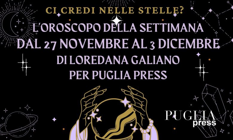 L’oroscopo della settimana dal 27 novembre al 3 di dicembre di Loredana Galiano, l’affermata astrologa in esclusiva per Puglia Press