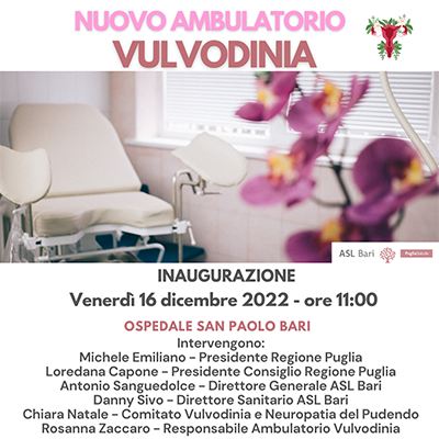 Bari – Vulvodinia, ASL attiva il primo ambulatorio. La ASL ha attivato il primo ambulatorio del servizio sanitario pubblico dedicato al trattamento della vulvodinia, patologia cronica ancora poco conosciuta ma già abbastanza diffusa nella popolazione femminile, tanto da essere diventata di recente oggetto di una proposta di legge nazionale mirata al riconoscimento di vulvodinia e neuropatia del pudendo come malattie croniche e invalidanti nei Livelli Essenziali di Assistenza (LEA). Il nuovo servizio sarà illustrato venerdì 16 dicembre alle ore 11 presso la direzione medica di Ospedale San Paolo a Bari. Intervengono il presidente della Regione Puglia, Michele Emiliano, la presidente del Consiglio regionale, Loredana Capone, il direttore generale della ASL di Bari, Antonio Sanguedolce, il direttore sanitario Danny Sivo, la paziente attivista Chiara Natale del Comitato vulvodinia e neuropatia del pudendo, e Rosanna Zaccaro, responsabile dell’Ambulatorio del benessere pelvico e perineale femminile.