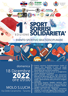 Taranto – Domenica al Molo Santa Lucia la prima edizione di “Sport, sorrisi, solidarietà”. Domenica 18 dicembre alle ore 9 al Molo Santa Lucia, in via delle Ceramiche a Taranto, infatti, si terrà la prima edizione di “Sport, sorrisi e solidarietà“, evento sportivo multidisciplinare organizzato da UISP, Vogatori Città di Taranto, ASD Olimpia e Circolo Velico Azimuth, con la partecipazione di diverse realtà sportive e solidali del territorio e con l’importante patrocinio del Comune di Taranto.
