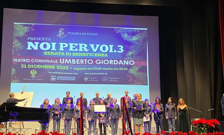 La Polizia di Stato, per il terzo anno consecutivo, ha realizzato la manifestazione benefica “Noi per Voi”, che si è svolta presso il Teatro comunale “Umberto Giordano” di Foggia.Quest’anno si è immaginata, con il patrocinio del Comune di Foggia e dell’Università degli Studi di Foggia, una progettualità condivisa con la Curia Vescovile aprendo nuove ed entusiastiche sinergie con le parrocchie e con i parroci delle stesse, arruolati a pieno titolo in attività di contrasto alle povertà culturali, all’educazione verso i valori della legalità e della condivisione.I fondi raccolti sono stati devoluti a favore di due parrocchie della città, che hanno partecipato e vinto i concorsi del “Progetto di riqualificazione urbana” e dell’ “albero di Natale più originale”.Protagonista assoluto dello spettacolo è stato senz’altro il CORO POLIFONICO della Questura di Foggia, impegnatosi con tenacia per la perfetta realizzazione della manifestazione e che è stato diretto dal Maestro Giulia PANETTIERI, la quale ha coordinato anche tutte le fasi tecniche delle performance canore.Durante il corso della serata, si sono poi susseguite le esibizioni di numerosi artisti, ospiti della grande famiglia Polizia di stato, che hanno apportato il loro contributo per la nobile causa benefica. Pertanto, è doveroso ringraziare il nostro rapper-poliziotto, Agente scelto Sebastiano Vitale in arte REVMAN; gli attori Dino LA CECILIA e Vincenzo RUSSO con il Maestro Guido Paolo LONGO; il Maestro d’arte Fabio CASTELLANETA; il chitarrista Francesco LOPARCO, il bassista Sergio PICUCCI con la vocalist Martina FICARRA; il musicista Nathan Maurizio RANA con la ballerina Fausta MAIORINO; il cantautore Fabio SILVIS; gli artisti Aurora CASSANO e Antonio RUOTOLO dell’Accademia Musical Art; il cabarettista Giovanni MANCINI.