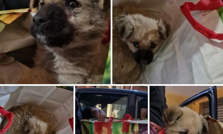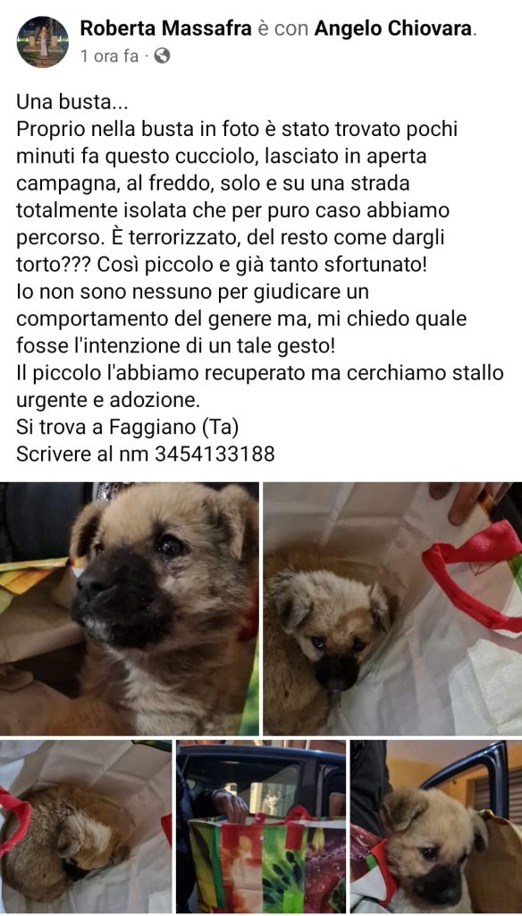 Come definire chi ha il coraggio di abbandonare un cucciolo di cane, in aperta campagna, al freddo e rinchiuso in una busta?