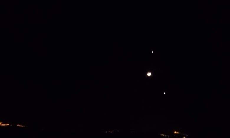I tre corpi celesti sono pressoché allineati in verticale con Giove in alto, la luna e Venere nella posizione più bassa.