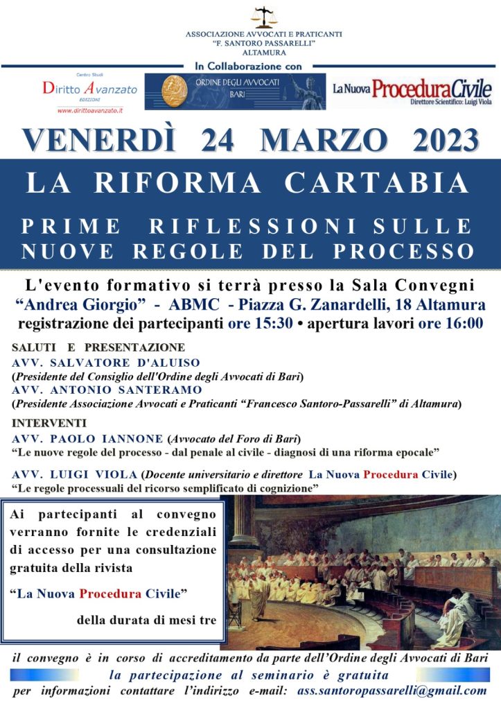 Il Convegno “La Riforma Cartabia, Prime riflessioni sulle nuove regole del Processo” è stato organizzato dall’Associazione Avvocati e Praticanti “F. Santoro Passarelli” di Altamura, in collaborazione con l’Ordine degli Avvocati di Bari, il Centro Studi Diritto Avanzato Edizioni e La Nuova Procedura Civile e attribuisce crediti formativi ai partecipanti e le credenziali per consultare gratuitamente per tre mesi la rivista La Nuova Procedura Civile.