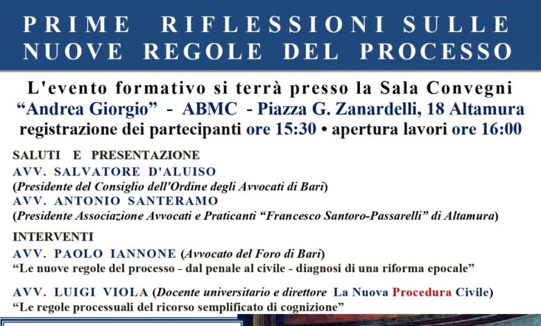 Interverranno: Il Presidente dell’Ordine degli Avvocati di Bari, Avv. Salvatore D’Aluiso, l’Avv. Antonio Santeramo, Presidente dell’Associazione Avvocati e Praticanti “Francesco Santoro Passarelli” di Altamura, l’Avv. Luigi Viola, Docente Universitario e direttore della Rivista “La Nuova Procedura Civile” che presenterà “Le regole del ricorso semplificato di Cognizione” e l’Avv. Paolo Iannone del foro di Bari, già relatore alla Camera dei Deputati, docente per la Scuola Superiore della Magistratura.