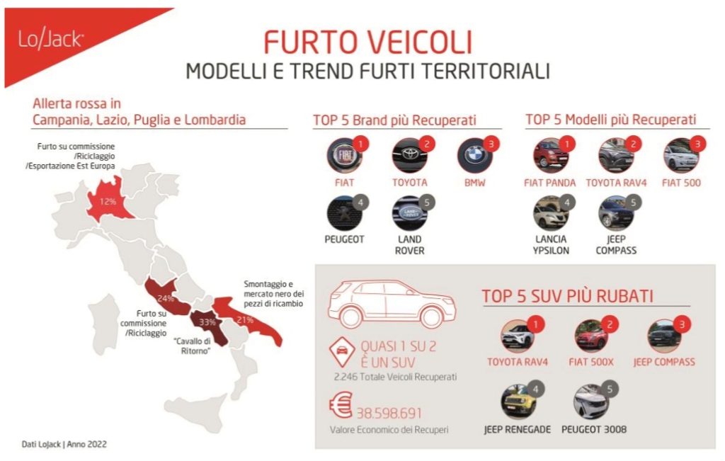 Tra le novità registrate lo scorso anno anche la crescita dei furti di vetture ibride ed elettriche, spesso sottratte per ‘recuperare’ e rivendere sui mercati paralleli i pacchi batteria, i cui costi incidono in modo significativo sul valore della vettura.” Nel 2023 questa fascia risulterà molto ambita.