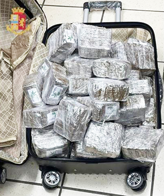 Il secondo uomo è stato trovato con 27 kg di hashish celati in un trolley suddivisi in pacchi da 100 grammi l’uno.