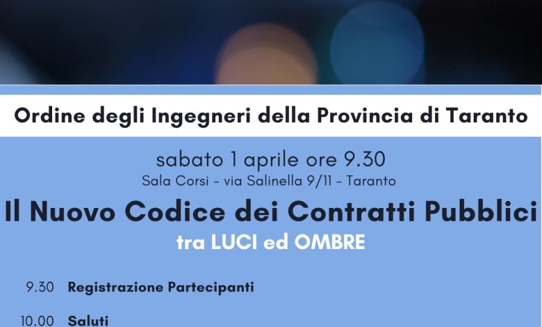 Il Nuovo Codice dei Contratti Pubblici, tra luci e ombre. Il Nuovo Codice dei Contratti Pubblici, tra luci e ombre è il titolo dell’incontro organizzato dall’Ordine degli Ingegneri della provincia di Taranto.