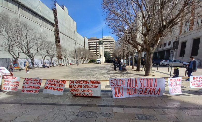 E nel giorno della festa, del trionfo, delle urla di acclamazione, nel giorno in cui Taranto ha finalmente sperimentato cosa vuol dire essere al proverbiale “centro dei riflettori”, i guastafeste non mancan mai. Mentre a qualche isolato di distanza, non più di due o trecento metri, oltre quattrocento ragazzi freschi di giuramento per le forze armate – Marina Militare e Carabinieri, in Piazza della Vittoria, un gruppo di ragazzi con qualche striscione ed un megafono cercano di portare all’attenzione, di “urlare” una realtà che il clima di festa aveva taciuto.