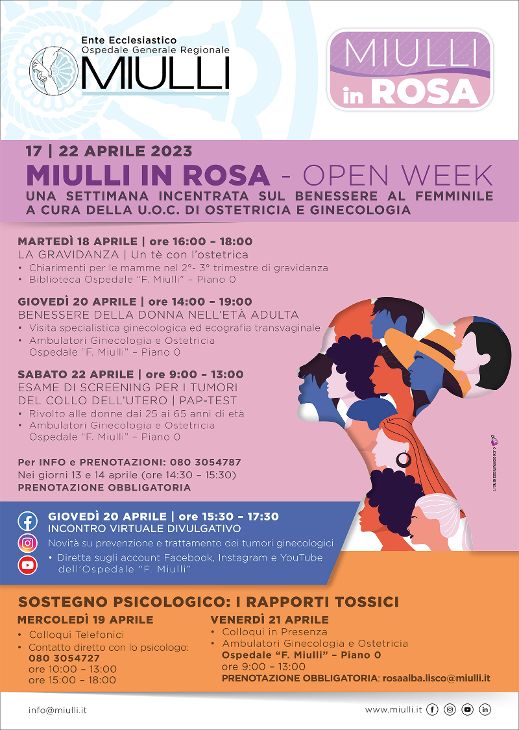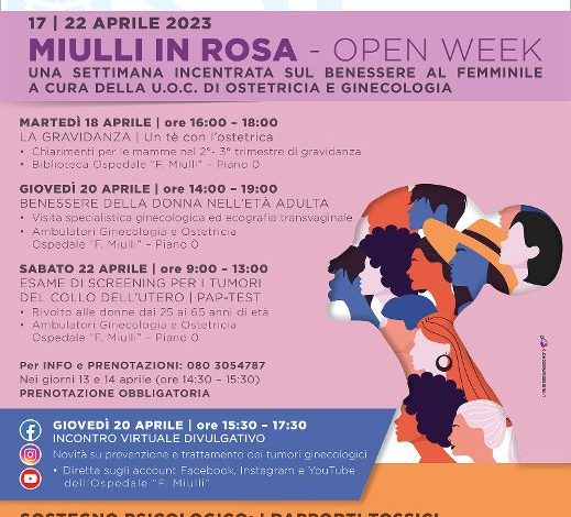 Il Miulli, che ha ricevuto proprio da Onda due Bollini Rosa per l’eccellenza delle cure dedicate alle donne, dedica dunque le giornate dal 18 al 22 aprile alla promozione e all’informazione riguardo alla prevenzione e alla cura delle principali patologie femminili.