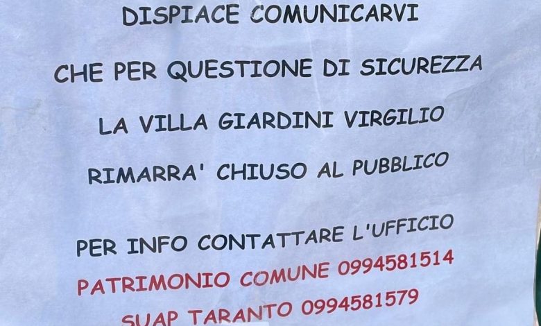Chi si recava a Taranto ai Giardini Virgilio, per una passeggiata o per godersi in momento di relax, da oggi non potrà più farlo. Almeno per ora. La motivazione, “motivi di sicurezza” di natura elettrica. A detta dell’assessore Azzaro, il tutto verrà ripristinato prima possibile dall’Enel.