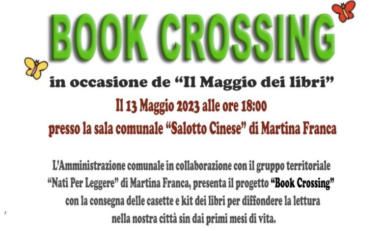 “Book Crossing” Martina Franca -casette di legno e libri da collocare in vari luoghi della città per il piacere della lettura. Un progetto per promuovere la lettura tra i bambini sarà presentato domani 13 maggio alle 18.00 a Palazzo Ducale, nella Sala degli Uccelli (Salotto Cinese). Si tratta di “Book Crossing”, un’iniziativa dell’Amministrazione Comunale e del Gruppo Nati per Leggere di Martina Franca, inserita nel programma de “Il Maggio dei libri”.