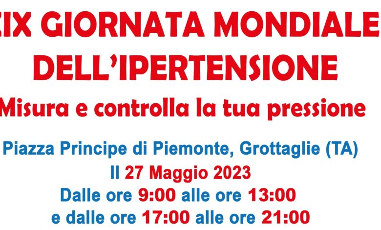 Misura la tua pressione e scopri come prevenire l’ipertensione: a Grottaglie. Sabato 27 maggio a Grottaglie si celebra la Giornata Mondiale contro l’Ipertensione Arteriosa, una condizione che aumenta il rischio di malattie cardiovascolari e che colpisce il 30% degli adulti e il 10% dei giovani in Italia.