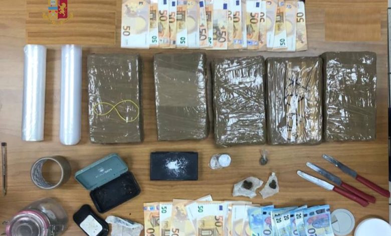 All’interno di uno zaino, sono stati rinvenuti 5 panette di cocaina, con un peso complessivo di circa 6 kg. Inoltre, è stato scoperto un contenitore in metallo contenente frammenti di hashish avvolti in carta da forno, per un totale di circa 20 grammi, insieme a un involucro cilindrico contenente dischi di hashish, pesanti circa 40 grammi. Inoltre, un contenitore di vetro sigillato ha rivelato una quantità di marijuana pari a circa 25 grammi. Sono stati anche rinvenuti due bilancini elettronici di precisione funzionanti, tre coltelli da cucina contaminati dalla sostanza stupefacente, e due rotoli di cellophane trasparente comunemente utilizzati per confezionare la droga.