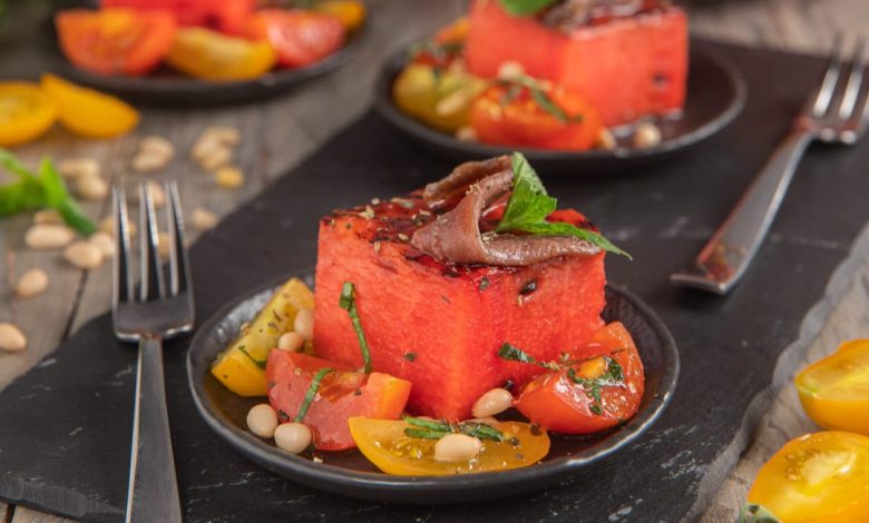 O in opere d’arte come anguria grigliata con pomodorini, acciughe e basilico.