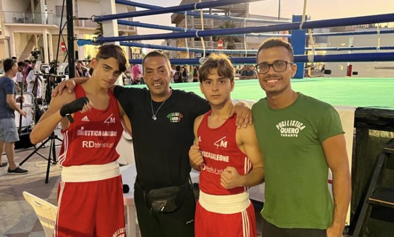 Altra vittoria per la Quero-Chiloiro a Mesagne firmata da Antonio Palmitesta nella manifestazione pugilistica organizzata dal Team Boxe Mesagne giovedì scorso presso la Villa Comunale. Il giovanissimo pugile tarantino, seguito all’angolo dal tecnico Cosimo Quero, ha battuto negli Junior 60 kg l’atleta della Sezione Giovanile delle Fiamme Oro di Marcianise, Claudio Giannino, in un match tecnico e corretto. Palmitesta sarà protagonista nella prossima serata targata Quero-Chiloiro, sabato 29 luglio a Fasano.