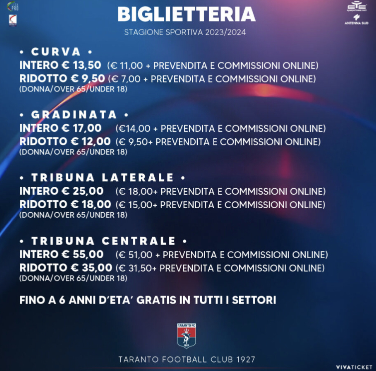 La società Taranto Football Club 1927 è lieta di annunciare le tariffe per la campagna abbonamenti 2023/24.