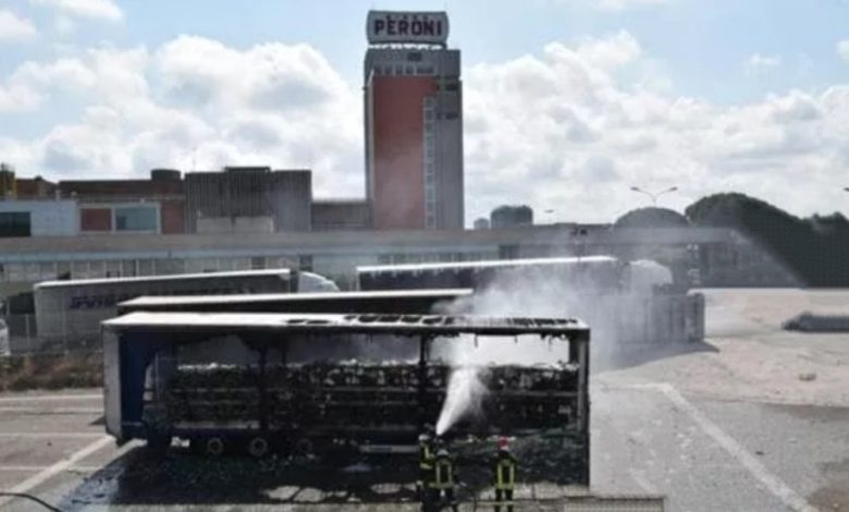 Un autoarticolato carico di birre Peroni prende fuoco all’esterno dello stabilimento di Bari e distrugge 10mila bottiglie
