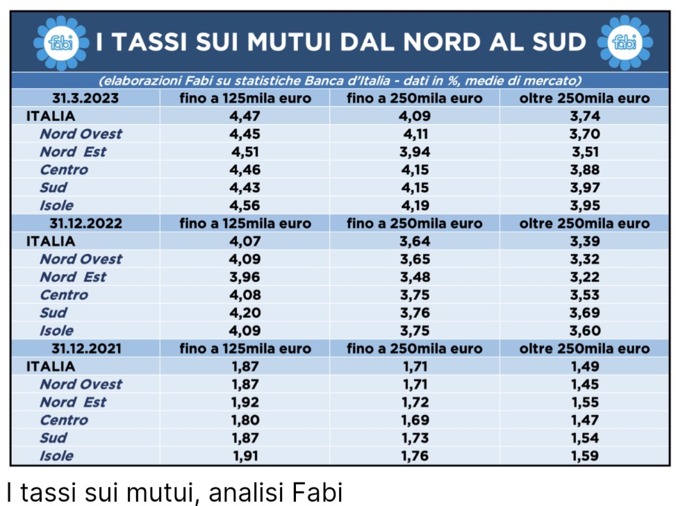 La disparità tra le regioni è evidente se si confrontano i dati relativi al mese di marzo 2023. Secondo Fabi, il tasso medio applicato sui mutui a tasso fisso è stato del 2,15% al Nord, del 2,35% al Centro e del 2,65% al Sud e Isole. Per i mutui a tasso variabile, invece, il tasso medio è stato dell’1,25% al Nord, dell’1,45% al Centro e dell’1,75% al Sud e Isole.