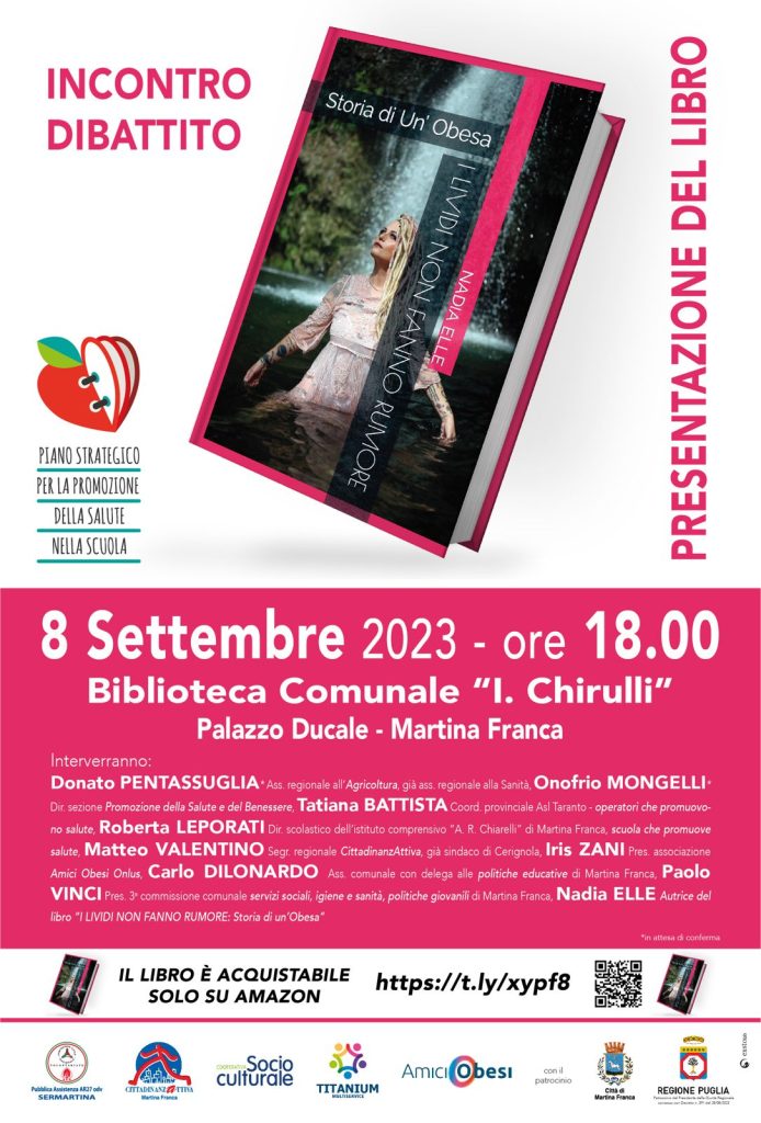 alle ore 18.00 presso la biblioteca comunale “I. Chirulli” di Martina Franca. Sarà un’occasione per confrontarsi sul tema dell’obesità infantile, sui progetti del Piano Strategico di Promozione della Salute nella Scuola della Regione Puglia, in particolare quelli sull’alimentazione, e sul libro “I lividi non fanno rumore: storia di un’obesa”. Saranno presenti l’autrice Nadia Elle, il sindaco della città, il dirigente scolastico dell’Istituto Comprensivo “G. Pascoli” e alcuni esperti del settore sanitario ed educativo.