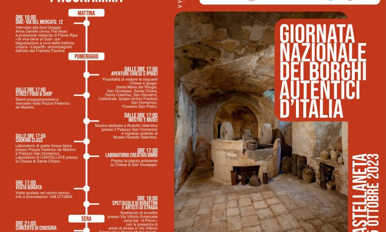 Castellaneta. Domenica 15 ottobre 2023 si svolgerà la Giornata Nazionale dei Borghi Autentici e Castellaneta ospiterà l’evento con una giornata speciale comprendente molte le iniziative messe in campo nella cittadina Castellanetana per l`intera giornata: parola chiave il Food & Turismo.