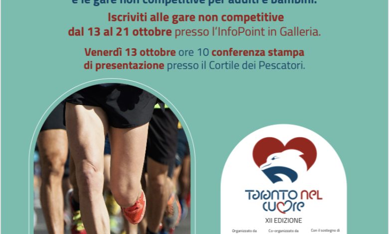 Torna l’appuntamento con “Taranto nel cuore – Half Marathon del Mediterraneo”, giunta alla XII edizione, in programma il prossimo 22 ottobre. La manifestazione è organizzata dall’Asd Taranto Sportiva, affiliata Fidal (Federazione italiana di atletica leggera), ed è valevole quale prova del Campionato regionale di corsa su strada CorriPuglia 2023.