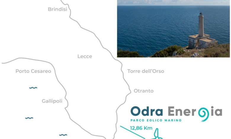 L’impianto Odra, da costruirsi nel sud Salento, nelle intenzioni progettuali consterebbe di 90 aerogeneratori alti 315 metri, sparsi in un’area marittima di 162 km quadrati, ricadendo nei comuni di Santa Cesaria Terme, Otranto, Castro, Andrano, Tricase, Alessano e Castrignano del Capo. Tutti questi Comuni, più un’altra quarantina circa, hanno aderito all’iniziativa di protesta che si terrà domattina a Porto Miggiano.