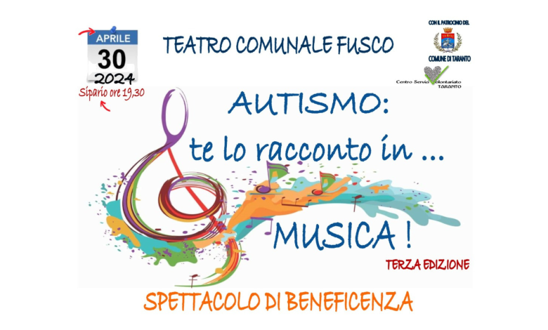 Giunto alla terza edizione “Autismo: te lo racconto in… musica!” è un evento promosso dalle associazioni del terzo settore, della provincia tarantina, quali Heart’s Music, Cooperativa logos, Gli amici di Raffaele, Autisticamente, A mano a mano, Autismo è Puglia e Angeli figli dell’autismo. L’evento gode del patrocinio del Comune di Taranto, del patrocinio morale del Csv Taranto (Centro Servizi Volontariato) è promosso dal media partner Ki.Fra comunicazione&eventi ed è supportato da Cuamy, Autismiamo e Mister Sorriso.