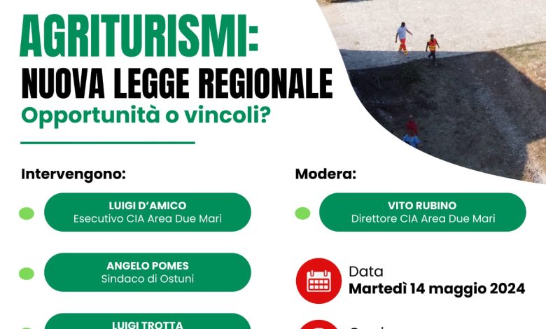 L’iniziativa, intitolata “Agriturismi, la nuova legge regionale: opportunità o vincoli?”, è organizzata da CIA Agricoltori Italiani Puglia Area Due Mari e dall’associazione Turismo Verde Puglia, prende il via alle ore 17:00 e prosegue fino alle ore 20:00.