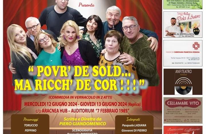 Commedia in vernacolo “Povr’ de sold.ma ricch de cor” a Castellaneta il 12 e 13 giugno 2024