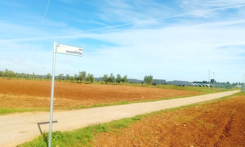 Che sia il nome, un po’ insolito, di una zona di campagna? Può essere, anzi, è la cosa più probabile. La riflessione più ironica, anzi sarcastica e piuttosto amara, che ci è venuta naturale fare, è che dopotutto il nome “sconfitta” ben si attagli ad una strada che conduce in un campo di pannelli fotovoltaici, dove un appezzamento di terreno è stato cioè sacrificato in nome delle energie rinnovabili, che riteniamo dovrebbero essere utilizzate solo e soltanto sulle costruzioni, sulle case o sui capannoni industriali.